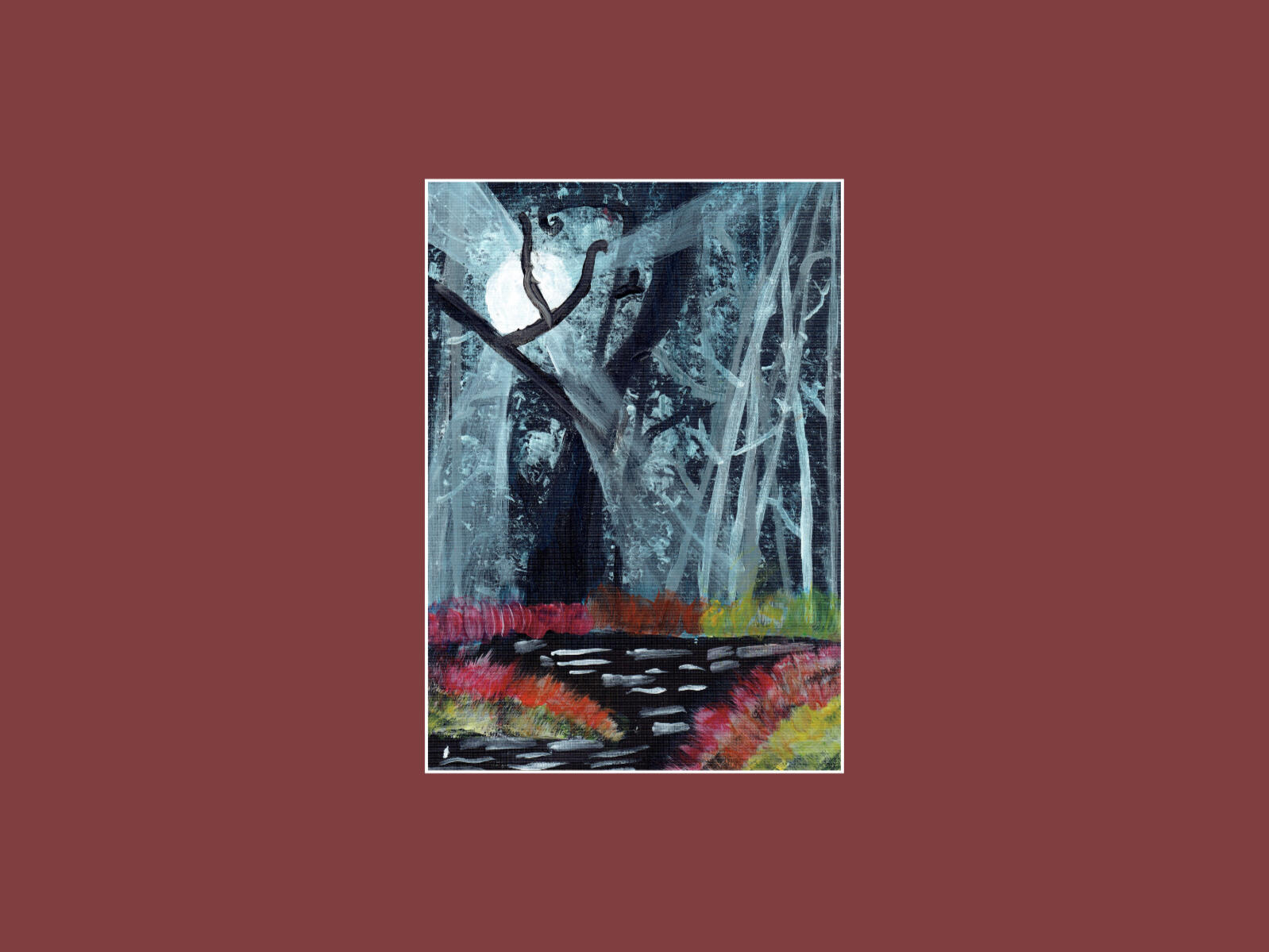 Description: This enchanting painting shows a shadowy forest lit by glowing moonlight shining through tall branches. In front, a dark river shimmers with white ripples, framed by bright, brushed flowers in warm colours. A dreamy nighttime world painted with bold strokes and creative wonder.